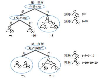 第1棵树使用年龄是否小于20和工资是否小于5 000作为分裂规则, 得到第1棵树的预测值, 并以此更新数据样本的预测值; 接着, 以新的预测值开始训练第2棵树, 第2棵树以是否为男性作为分裂规则, 得到第2棵树的预测值.最终的预测值为两棵树的预测值之和, 例如, 标识为“/”的用户, 预测值为5加上5, 等于10.