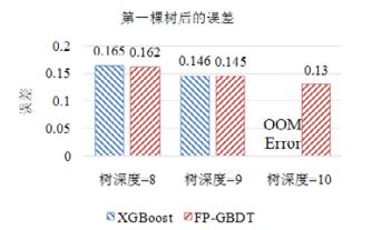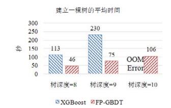 深度增大时, XGBoost和FP-GBDT的误差均下降, 证明更深的树可以提高模型的准确率, 代价是训练时间的增大.当树的深度从8增大到9时, 数据并行策略下梯度直方图的大小增大1倍, 因此, XGBoost的运行速度慢了2倍; 继续将树的深度增大到10时, XGBoost出现了内存溢出的错误.