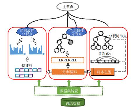 (5) 产生全局最佳分裂点的计算节点执行分裂树节点的操作, 并产生数据样本在树中的位置; 然后, 使用一种比特图的压缩方法发送数据样本的位置给其他计算节点.