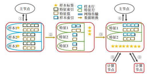 (3) 重切分特征行.由于一个特征的特征值可能存在多个计算节点上, 因而每个特征在多个计算节点上存在局部特征行.本方法通过MapReduce操作重切分所有计算节点上的局部特征行, 使得每个特征的所有局部特征行在一个计算节点行进行汇总, 形成此特征完整的特征行.通过这个操作, 每个计算节点负责一个特征子集, 存储着这个特征子集中所有特征的特征行, 由(样本索引, 特征值)的键值对组成;