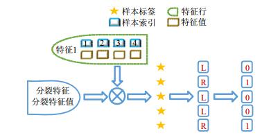 找到一个树节点的最佳分裂点后, 下一步是分裂树节点.使用特征并行策略时, 某个计算节点产生了全局最佳分裂点, 树节点的分裂结果(数据样本的位置)也只有此计算节点知道, 因而, 此计算节点需要将数据样本的位置广播给其他计算节点.为了减少通信开销, 本文设计了一种比特图的方法来压缩数据样本的位置, 如图 5所示.