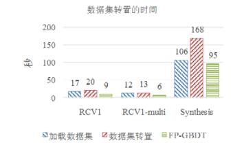 首先展示分布式数据集转置方法的性能, 实验数据如图 6所示, 从HDFS上加载3个数据集的时间分别是17s、12s和106s.使用简单的直接数据集转置, 在RCV1, RCV1-multi和Synthesis数据集上需要的时间分别是20s、13s和168s;而FP-GBDT执行数据集转置的操作, 在3个数据集上的耗时分别是9s、6s和95s, 相比原始的数据集转置方法, 速度得到了最高2倍的提升.虽然相比于数据并行的策略, FP-GBDT带来了额外的时间开销, 但是在后面的实验中将显示, FP-GBDT显著提升了整体的性能.